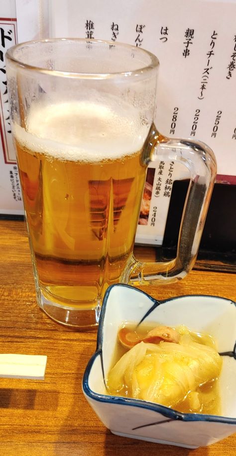 まずは、ビール!お通しはロールキャベツだった。