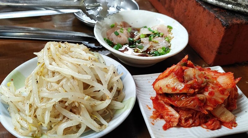まずは左から、もやし、酢モツ、キムチ